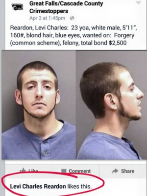 У США затримали розшукуваного злочинця Леві Чарльза Рердона. Його знайшли, після того, як він поставив "лайк" під записом про нього в публікації правоохоронних органів у Facebook.