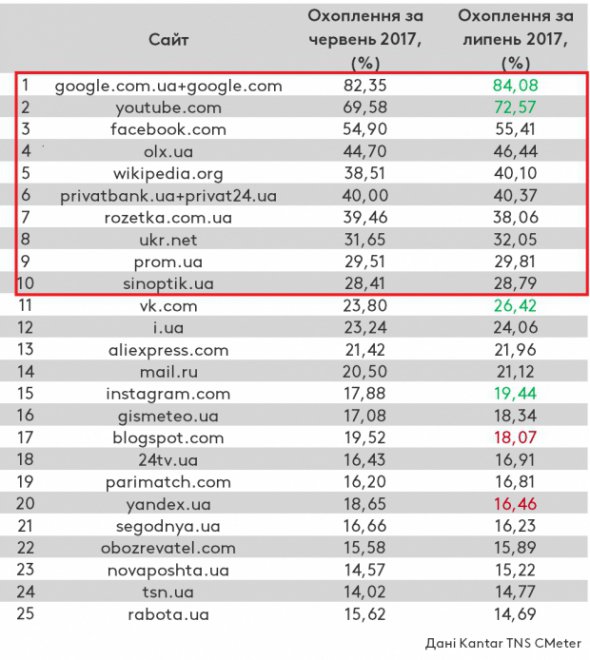 Водночас, Vk.com посідає 11 місце, хоча, порівняно з червнем 2017 року, зріс в охопленні.