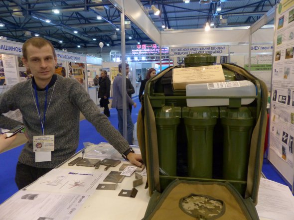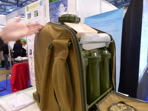 Біля стенду Київського політехнічного інституту імені Ігоря Сікорського можна переглянути переносну установку для очистки води "Сова". Має вигляд туристичного рюкзака кольору хакі вагою 7 кг. Його створив науковий співробітник лабораторії екотехнологій Тарас Нижник.