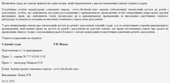 У документі йдеться про кримінальне розслідування справи за умисне вбивство, вчинене групою осіб. Слідчим в ході розслідування потрібно отримати доступ до даних Facebook-аккаунта, який уже видалено з мережі.