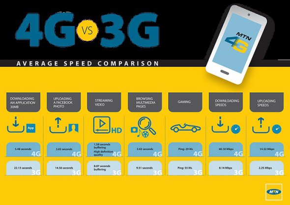 4G миттєво завантажуватиме у 5-7 разів більше інформації. До прикладу, у 4GYouTube-ролик у HD-форматі завантажиться миттєво. У 3G для цього потрібно 1-5 хв. Мобільний додаток при 3G скачується за 3 хв. На 4G - за 25 с.