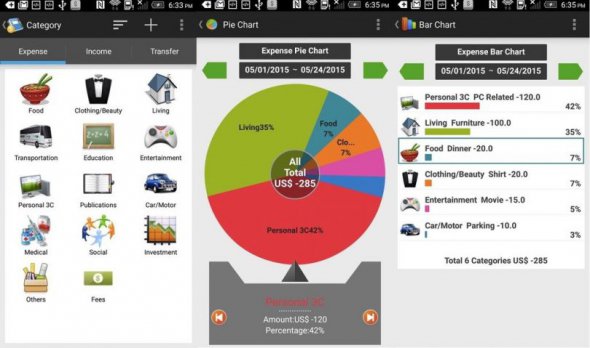 Після запуску програми користувач одразу потрапляє до віконця з фінансовими операціями за один день. Пошук здійснюється за ключовими словами, категоріями, дат, рахунками, проектам і одержувачам. Додаток дозволяє завести три рахунки: "Готівкові", "Кредитна карта" і "Вклад".