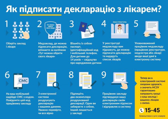 З квітня в Україні розпочалась приписна кампанія Міністерства охорони здоров'я "Лікар для кожної сім'ї". Зараз головна задача пацієнтів – обрати собі лікаря та підписати з ним декларацію. Місце реєстрації вже не має ніякого значення. Укласти угоду можна буде у будь-який час, хоч через рік. Кожен член родини повинен підписати декларацію з лікарем. Якщо лікар не влаштовує, можете підписати документ з іншим. Діти можуть обслуговуватись разом з батьками у сімейного лікаря або у педіатра. Звернутись можна і до лікаря з приватної клініки, якщо цей заклад підписав договір з Національною службою охорони здоров'я України.