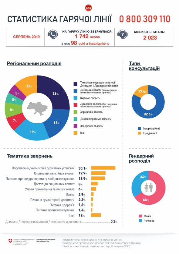 Телефон "гарячої лінії" громадської організації "Донбас СОС": 0 800 309 110. Кожного місяця до них звертаються близько 2 тис. людей. Минулого місяця 24% звернень були з окупованих територій.