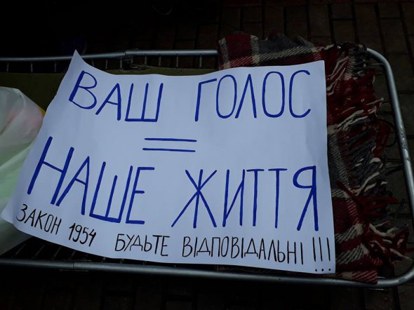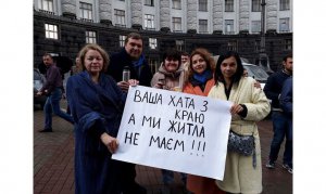 Переселенці в домашніх халатах і тапочках влаштували флешмоб на підтримку Закону №1954 під будівлею Кабміну.