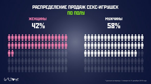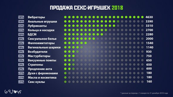 Більше 5 млн осіб відвідало один з найпопулярніших секс-шопів України в 2018 році, що на 1 млн більше ніж у минулому році. Магазин 69.Toys приводить Інфографіки продажів секс-іграшок за категоріями і карту регіонів України, де інтим-товари користувалися найбільшою популярністю. Середній кошик склав 1008 грн.