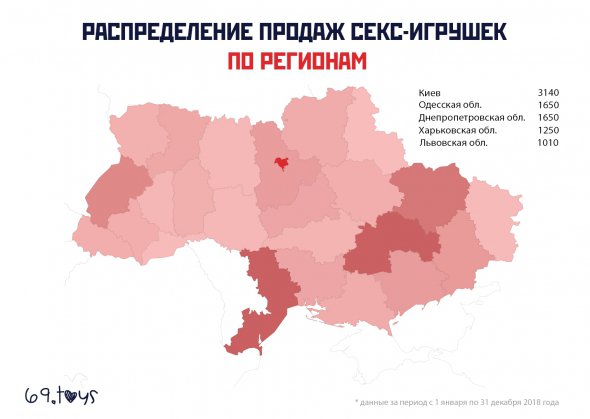 Прогнозовано лідером з продажу секс-іграшок серед регіонів став Київ. Слідом за столицею частіше за інших купували товари для дорослих жителі Одеської, Дніпропетровської, Харківської та Львівської областей. До 2014 року в ТОП-5 регіонів постійно входили Донецька область та АР Крим.