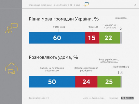 За даними опитування, українська мова є рідною для 60% громадян України (не враховуючи окуповані території). Російську мову вважають рідною 15%, обидві мови рівною мірою – 22%. Говорять завжди або переважно українською вдома 50% українців, російською – 24%, "іноді російською, іноді українською" - 25%.