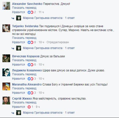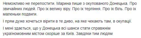 За словами Марини, звичайні жителі Донецька хоч і бояться, але зовсім не забули українську мову. Це говорить про їхню віру в майбутнє у складі України.