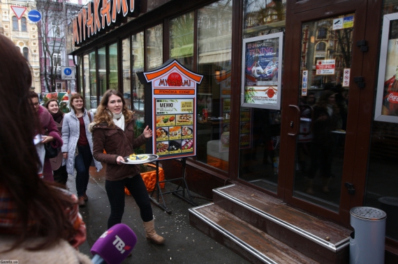 - Не день споживача торік ми зайшли у Кофеїн коло Льва Толстого, - згадує Оксана переможним тоном. - Вони були в шоці. Але там було важче, тому що там взагалі два на два приміщення: журналіст на волонтері, волонтер на журналістові. Не було де розійтися. А тут бачте, якось вільно. Зручний ресторан. Я навіть вчора сюди зазирнула, прикинула, як хто буда стояти. Ну кому що, а курці просо. Але це все ховається в порівнянні з тим, що було в Танукі. В листопаді минулого року там був великий скандал. Канадійка українського походження Лада Рослинська зайшла в цей ресторан. Уявіть собі діаспорянку: вона читає "суп из свеклы"? У неї лізуть очі на лоба. Вона не зобов'язана знати, що це таке. Питає в офіціантки, що це означає, а та: "Не поняла, а чего это я вам должна обяснять что-нибудь?" і пішло-поїхало. Вона пересварилася з двома офіціантками, з адміністратором, з охоронцем, який там свої 5 копійок вставляв. Виявилося, що власник є москвичем і українську забороняє у цьому закладі. При цьому ситуація настільки складна психологічно, що обидві офіціантки мало не розплакались перед цим поважним панством. Казали, що цих дівчат звільнять, якщо вони перейдуть на українську мову. Ці сварки тривали годину. Далі Лада не витримала і викликала наряд міліції. Самі розумієте, які в міліції були очі. Закінчилось тим, що виконавчий директор нам написала, просить скандал далі не роздувати і дати їм час виправитися. Було ще таке продовження: усі українські дипломати закликали посольства і відомства не ходити в ресторан "Танукі" на Золотоустівській. Тепер він справедливо вважається символом українофобства.