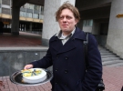 - Ми вважаємо ваш заклад найменш мовно дисциплінованим. У вас усе російською мовою. Ви не зважаєте на часті звернення наших споживачів. Цей заклад має приблизно п'ять скарг від різних людей про відсутність україномовного меню. Цей заклад ігнорував усі наші звернення протягом довгого часу. Ми зверталися до багатьох закладів мережі Муракамі. Вони досить хамсько відповідали на наші звернення. Офіціанти сміялися: "А як це так - писати вам борщ замість місусу у меню?" Ми не вважаємо, що це смішно. Вважаємо це зневагою.. Вручаємо вам за це гнилого кабака й оголошуємо ваш заклад найгіршим за підсумками 2012 року, - кладе тарілку з кабачком на стіл адміністраторки.