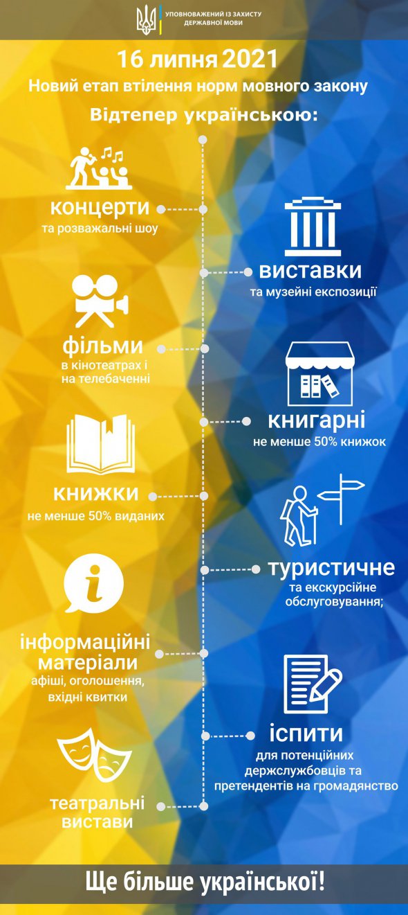 Відтепер усі концерти, шоу, культурно-мистецькі, розважальні, видовищні заходи мають проводити державною мовою. Винятки передбачені для пісень і фонограм, та якщо використання іншої мови є творчим задумом організатора. Супровід усіх заходів має бути винятково українською. Виступи осіб, які не знають державної мови, мають супроводжувати синхронним або послідовним перекладом, повідомив Офіс уповноваженого із захисту державної мови.