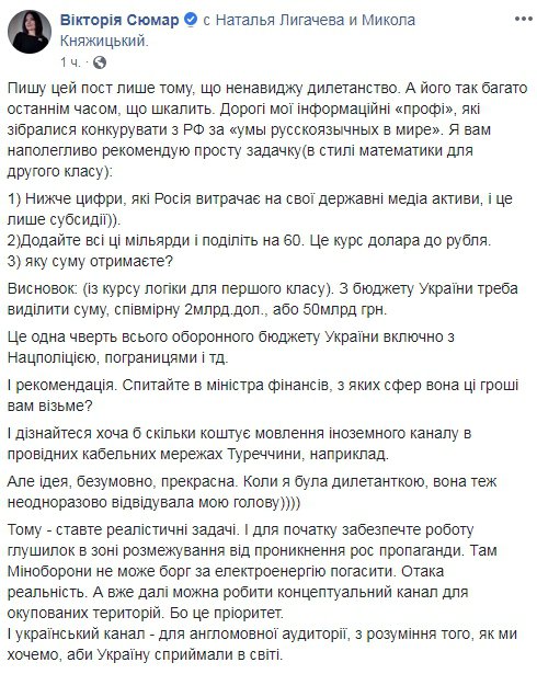 "Це одна чверть всього оборонного бюджету України включно з Нацполіцією, прикордонниками. І рекомендація. Спитайте у міністра фінансів, із яких сфер вона ці гроші вам візьме? І дізнайтеся хоча б, скільки коштує мовлення іноземного каналу в провідних кабельних мережах Туреччини, наприклад. Але ідея, безумовно, прекрасна. Коли я була дилетанткою, вона теж неодноразово відвідувала мою голову", - пише Сюмар.