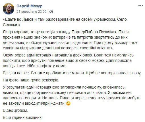 У відомій мережі київських закладів "Портер Паб" відмовились обслуговувати клієнтів українською.