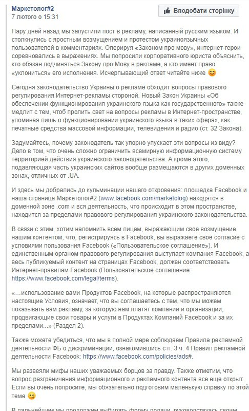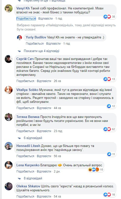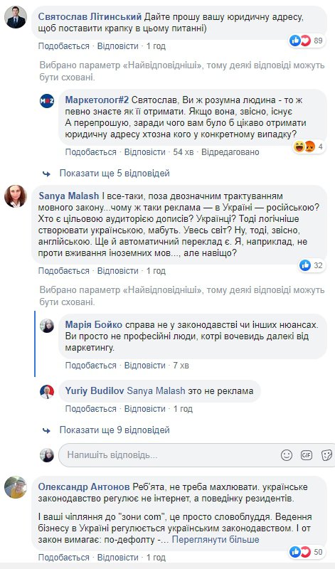 Заявили, що його працівники ніколи не спілкуватимуться українською мовою в соціальних мережах, оскільки цього не вимагають правила Facebook та закони України. Зауважили, що їх не цікавлять зауваження їхніх потенційних клієнтів щодо їхнього прохання надати їм контент українською мовою.