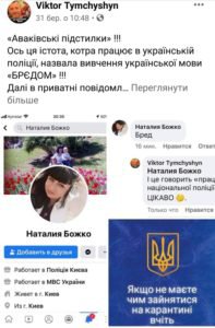 "Аваківські підстилки! Ось ця істота, котра працює в українській поліції, назвала вивчення української мови "брєдом"! Далі в приватні повідомлення отримав суцільний "рускоязичний мат", – написав Віктор Тимчишин у Facebook.