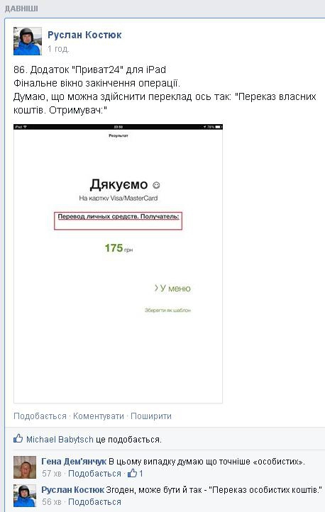 "Отже, друзі, за сьогодні: 1. Стартова сторінка сайту тепер вантажиться українською (ура! вітаю всіх з першим кроком). 2. Створили робочу групу зі співробітників різних департаментів. Ділюсь файлом, з яким ми працюємо - він живий, тут прізвища, дати, напрямки роботи і деяка наша внутрішня термінологія - welcome на нашу внутрішню кухню https://docs.google.com/…/1rw6ypEr73lJ11gBtHMu5HzGOjB…/edit… Кому складно\не цікаво читати весь файл, я буду публікувати у цій групі основні досягнення щодня або раз на кілька днів. До нас за рішенням Олег Гороховский сьогодні приєдналась ще одна дуже сильний менеджер з банку - Валентина Палий. Також дякую за підтримку Дмитрий Дубилет 3. Усі завдання поділені на блоки: зовнішня реклама, відділення, банкомати, поліграфія, інтернет-ресурси, канали комунікації з клієнтами, мобільні додатки, кол-центр, внутрішні програмні комплекси банку. 4. Тексти Приват24 і мобільних додатків віддали на ревізію коректорам. 5. Видані інструкції співробітникам, які спілкуються у соц. мережах, - діалоги будуть ініціюватись українською. Ух! Махіна велика. Щось вдасться зробити швидко, десь - більше часу. Внутрішні наради в банку починаємо поступово проводити українською (будь-який примус, впевнений, нам зараз тільки зашкодить). Дякую Svyatoslav Litynskyy та всім, хто допомагає! Разом переможемо!".