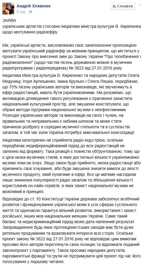 Співак гурту "Бумбокс" Андрій Хливнюк навіть заманівестував його на своїй сторінці в соцмережі. Зараз цієї заяви там уже нама: