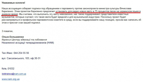 Адже завдання української держави полягає в тому, аби плекати національну культуру й розвивати ринок саме української пісні, а не російської, французької чи іспанської".