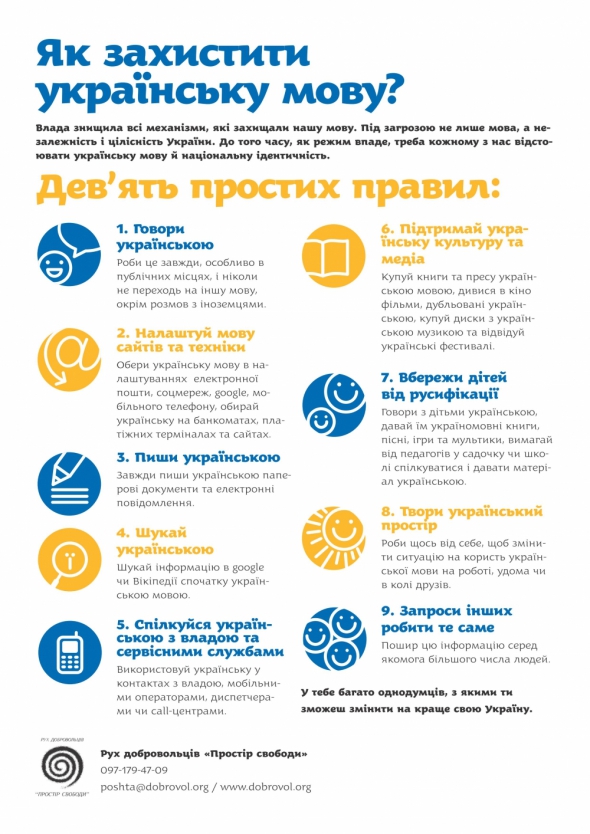 Додам, що у разі, якщо водномить перейти на українську з усіма і повсюдно може бути нелегко, варто робити це поетапно. Свого роду інструкцію тим, хто має бажання сприяти розвиткові української мови, але не знає як, розробив рух добровольців "Простір свободи". Керуючись дев'ятьма простими правилами, можна відчутно змінити мовний простір довкола себе та зробити хороший внесок у суспільно важливу справу.