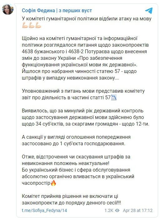 "У комітеті розглядалося питання щодо законопроєктів 4638 Бужанського і 4638-2 Потураєва щодо внесення змін до закону України "Про забезпечення функціонування української мови як державної". Йшлося про набрання чинності статтею 57 – щодо штрафів у випадку невиконання закону", - написала в Telegram народна депутатка від "Європейської солідарності" Софія Федина.