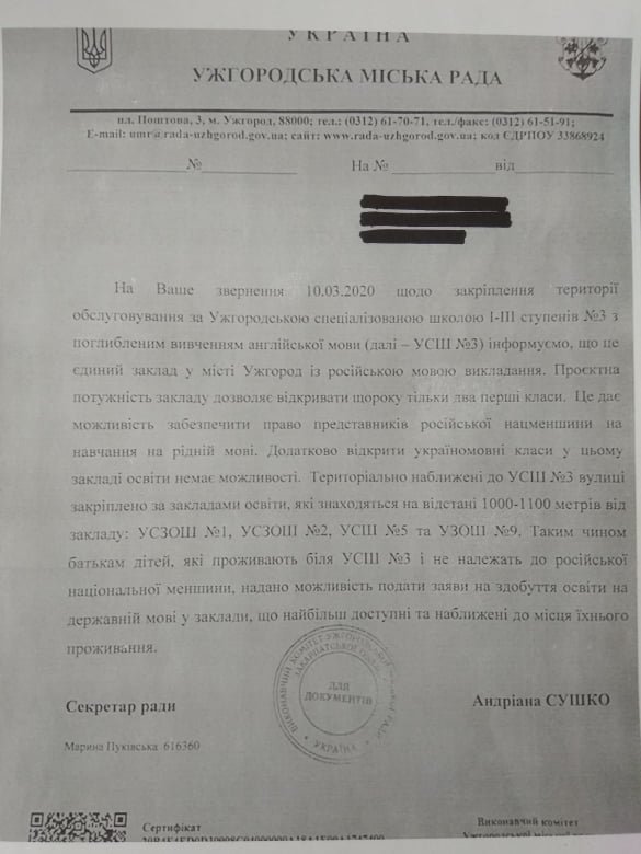 "Це пряме порушення частини 2 статті 66 Закону України "Про освіту": районні, міські ради та ради об'єднаних територіальних громад закріплюють територію обслуговування за закладами початкової та базової середньої освіти. Чому в Ужгороді для російської меншини створені такі привілеї?", - додав він.