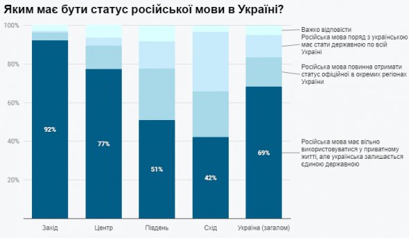 Також громадська думка має регіональні відмінності. Однозначно обстоюють українську як єдину державну в Західному регіоні - 92%, у Центральному регіоні – 77%. У Південному регіоні статус російської мови як мови повсякденного спілкування за визнання української як єдиної державної підтримує 51%. Найбільш значущий статус російської мови визначається у Східному регіоні.