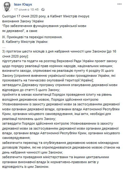 Уряд повинен був до 16 січня 2020 року підготувати та подати на розгляд Верховної Ради проєкт закону щодо порядку реалізації прав корінних народів, національних меншин, написав мовознавець Іван Ющук у Facebook.