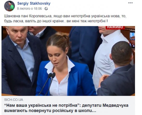 "Шановна пані Королевська, якщо вам непотрібна українська мова, то, будь ласка, валіть до іншої країни. Ви мені теж непотрібні!" - написав Стаховський.