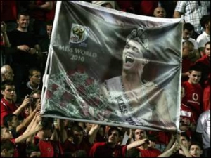 Уболівальники зобразили Кріштіану Роналду в короні, схожу на ту, яку зазвичай вручаються переможницям конкурсів краси. Крім того, на банері була намальована емблема чемпіонату світу 2010 року в ПАР.