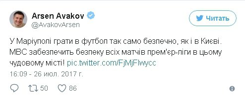 "У Маріуполі грати в футбол так само безпечно, як і в Києві. МВС забезпечить безпеку всіх матчів прем'єр-ліги в цьому чудовому місті", - написав Аваков.