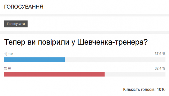 37,6 % опитаних відповіли "так" на питання "Тепер ви повірили у Шевченка-тренера?" 62,4 % голосів набрала відповідь "ні".