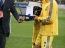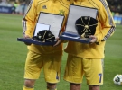 Першим нагороду отримав Блохін, потім Тимощук і Шевченко. Футболісти кілька хвилин позували для фотографів. Шева обняв Анатолія за плече. Після фотосесії гравці повернулися у стрій для виконання національних гімнів.
