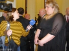 Стелла Захарова просить сфотографувати її біля прапора, але змінює думку і позує для фото на фоні заповненого залу. Аліна Шатернікова присідає і розписується у нижньому кутику. Все полотно вже заповнене автографами.