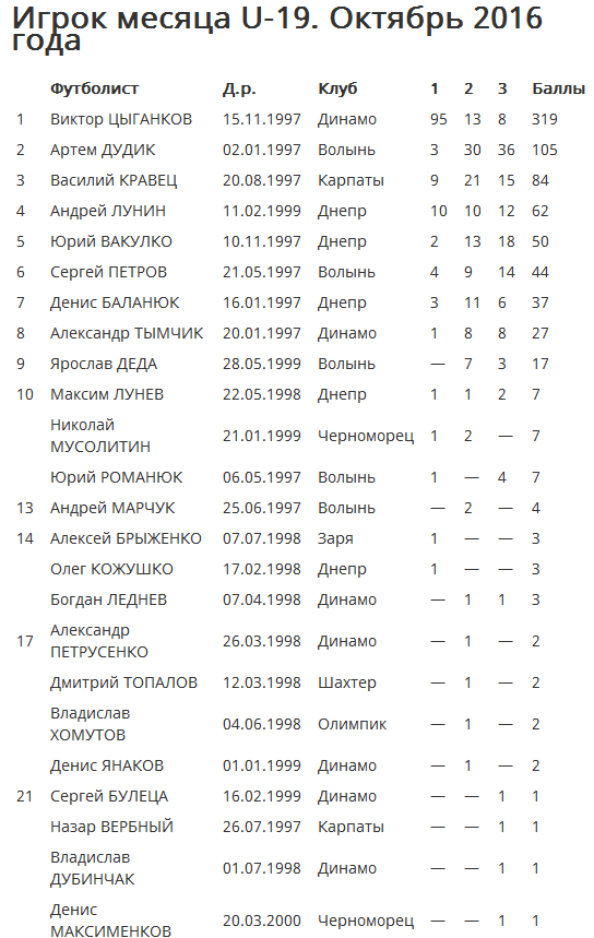 Вдруге поспіль переможцем місячного голосування премії "Золотий талант" у категорії U-19 стає півзахисник "Динамо" Віктор Циганков. У жовтневому опитуванні він набрав трохи менше балів (319), ніж у вересневому (337), але утричі випередив найближчого конкурента - Артема Дудика (105).