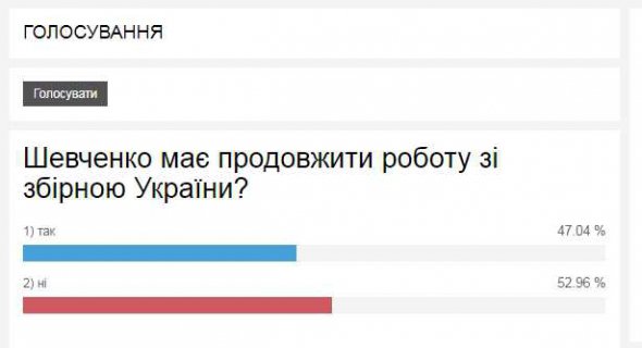 Участь в опитуванні взяли 1131 респондентів. 47.04 % опитаних сказали "так" на питання "Чи має Шевченко продовжити роботу зі збірною України?". 52.96 % відповіли негативно.