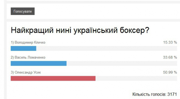 Більшість однозначно підтримали кандидатуру Олександра Усика - 50.99%. Останній сьогодні вночі переміг нокаутом у США південноафриканця Табісо Мчуну. Ще раніше у вересні перед Усиком капітулював поляк Кшиштоф Гловацький.