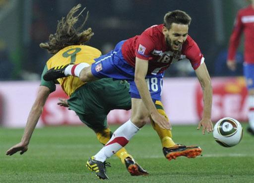 Перший по-справжньому небезпечний момент створили серби на 12-й хвилині. Мілош Нінковіч віддав прекрасний пас врозріз на Красіча, той вийшов один на один з воротарем, обіграв його на високій швидкості, але вже не зміг зупинитися, і пробив повз ворота. Через десять хвилин захисник Браніслав Іванович опинився на позиції нападника, пробиваючи з меж воротарського, але австралійський голкіпер Марк Шварцер рукою відбив цей м"яч. На 38-й хвилині Красич вийшов на ударну позицію, і пробив повз Шварцера, але гол цей зарахований не був, так як у серба було положення поза грою. Австралійці за перші 45 хвилин лише кілька разів небезпечно контратакували, але удари Емертона і Кеннеді не досягли мети.