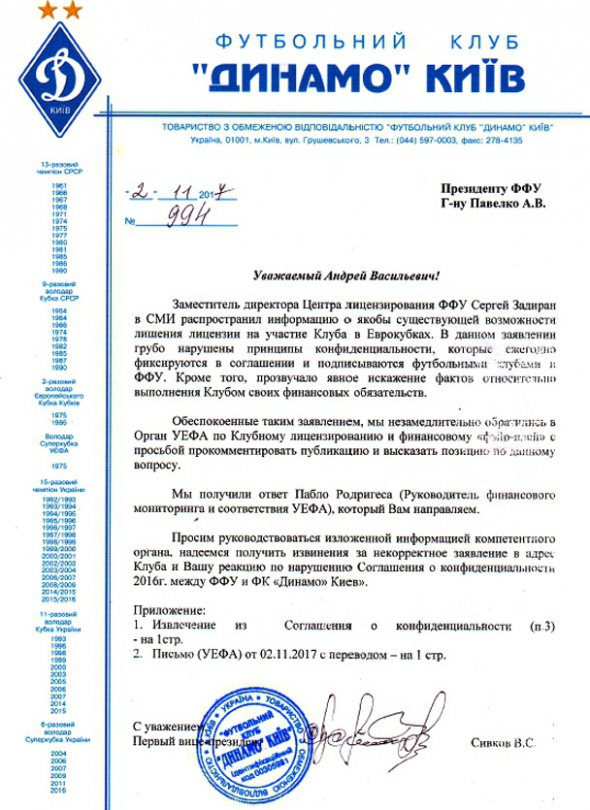 "Динамо" посилається на лист з УЄФА від керівника фінансового моніторингу та відповідності Пабло Родрігеса на ім'я першого віце-президента клубу Віталія Сівкова.