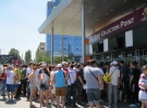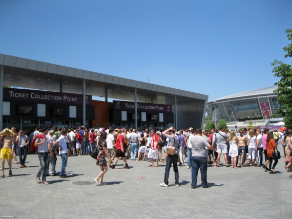 У касах "Донбас Арени", біля яких ще вчора не було ні душі, вишикувалися черги по 50 - 80 осіб. Напередодні з'явилася інформація про те, що ввечері "викинули" квитки на сьогоднішній матч Франція - Англія. Квитки нібито з'явилися через відмову від них в останній момент французьких і англійських уболівальників. Проте, і сьогодні квитки неможливо придбати. Отримати їх у касах можуть тільки ті, хто зробив попереднє замовлення.
