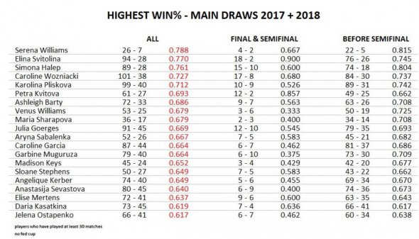 Перше місце займає Серена Вільямс, яка виграла 78,8% матчів, щоправда, американка зіграла лише 33 матчі - 26 перемоги і 7 поразок. На третьому рядку Сімона Халеп, у неї 76,1% перемог при 89 перемогах і 28 поразках.