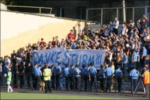 Природно, будь-яка осічка суперника дає привід протиборчим сторонам повправлятися в дотепності. Позавчора, окрім іншого, фанати "Дніпра" відзначилися баннером в адресу... австрійського "Штурму" (Sturm перекладається з німецької насамперед, як буря або шторм). Дніпропетровці вивісили полотно з написом "Danke, Sturm!" ("Спасибі, Штурм!"), тим самим демонструючи свою радість від вильоту "Металіста" з Ліги Європи.