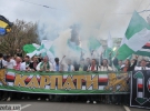 Ідучи колоною по вулиці Січових Стрільців фанати "Карпат" розгорнули великі прапори із зображенням Бандери, Шухевича, і Коновальця. Вони вигукували гасла "Слава Україні - смерть ворогам", "Бендера прийде - порядок наведе". Також палили димові шашки і фаєри.