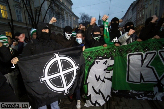 Крім того, фани несли великий портрет Романа Шухевича і червоно-чорний прапор.