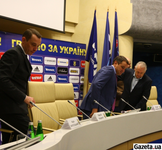 Після вступних слів наставника до зали входить сам Андрій Шевченко. Присутні аплодують. Одягнений у темний костюм із краваткою. Тисне по черзі руки Михайлу Фоменку та Андрію Павелку, сідає поруч із останнім. Напроти нового тренера ставлять іменну табличку. По інший бік від президента ФФУ — головний тренер збірної.