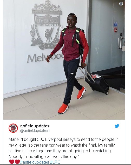 "Я купив 300 футболок "Ліверпуля" і відправив їх людям з мого села Бамбалі, так що фанати зможуть подивитися фінал у червоних майках. Моя сім'я як і раніше живе в селі, і всі вони дивитимуться матч. 26 травня в моєму селі ніхто не працюватиме", - сказав Мане Independent.