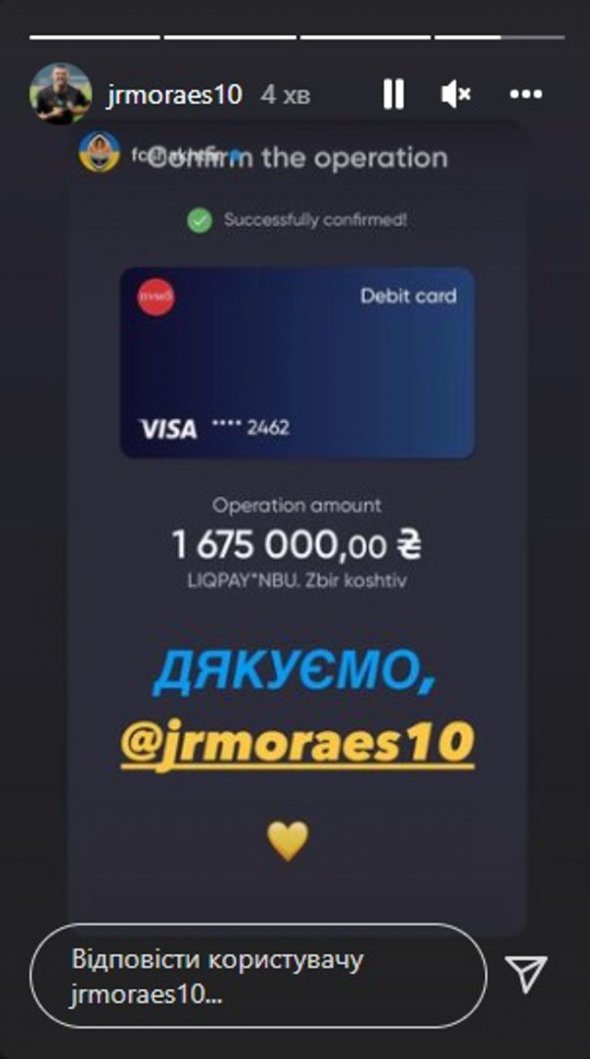 Нападник "Шахтаря" перерахував нашій армії 1,675 млн гривень. Скрін оплати натуралізований бразилець виклав в Instagram.