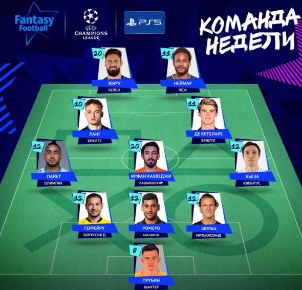 Пару нападників склали Неймар та Олів'є Жиру із ПСЖ та "Челсі". У півзахисті опинились одразу 2 гравці "Брюгге" - Шарль де Кетеларе та Ноа Ланг, вінгер "Ювентуса" Федеріко К'єза, герой "Істанбул Башакшехіра" Махмед Кавечі та лідер "Марселя" Дімітрі Пайє. Трійцю ж захисту утворили Рафаель Ґеррейро з "Боруссії" Дортмунд, Крістіан Ромеро з "Аталанти" та Александр Шольц із "Мітьюлланда".