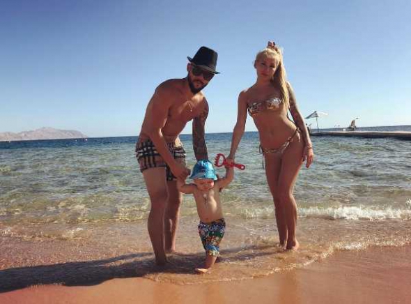 Стильний Микола Морозюк з дружиною і сином на пляжі.