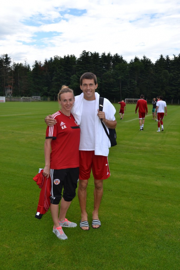 Чи розчарувалася в футболістах, близько спілкуючись з ними? Скоріше навпаки. Приміром, працюючи в клубі, відкрила для себе, що вони - люди дуже веселі. Під час тренувань, коли важко фізично, гумор підтримує, додає сил та енергії. Жартують завжди, скрізь і всюди. На тренуваннях з аеробіки, які вони "дуже люблять", хлопці в такт музиці в один голос голосно підспівують під знайомі мелодії і фрази. Це весело. Були й такі, які перший час навіть намагалися позагравати прямо на заняттях. Але швидко зрозуміли, що це марно: після моїх навантажень сил не залишалося навіть на розмови. Той самий Євген Хачеріді: як не намагався сховатися в останньому ряду, а все одно опинявся в першому і відпрацьовував нарівні з усіма. Тим більше, на заняттях завжди присутній Віталій Кварцяний. А від його пильного ока не сховаєшся.